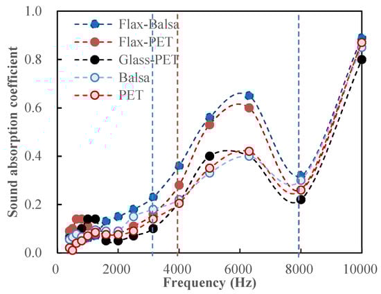 An effective way to improve the acoustic absorption performance of composite laminate is inducing a porous material as the core material to cooperate a sandwich structure. Meanwhile, the sound wave can be reflected repeatedly by the stiff composite skins back to the interior of the cellular core material for energy exchange and dissipation. Figure 10 shows the variation of SACs with frequency of Flax-Balsa, Flax-PET, and Glass-PET sandwich structures and their corresponding core materials. It can be seen from Figure 10 that the SACs increase with frequency for all the samples, reaching at least 0.8 at 10,000 Hz. For flax-fiber-reinforced composite skin-based sandwich structures, the SACs of the sandwich panel are higher than those of the core materials in all frequency levels. The SACs are clearly improved for the balsa if cooperated with FFRC skins from 1600 Hz. The sound absorption peak of the Flax-Balsa sandwich panel is 0.65, which is approximately 63% and 86% enhancement compared to that of the balsa and FFRC, respectively. On the other hand, the SACs of PET foam have been distinctly enhanced over 40% at high frequency from 4000 Hz when cooperated with FFRC skins. It can be concluded that flax fiber skin-based sandwich structures provide better sound absorption performance than their corresponding core materials at a large range of frequency band, and the composite skins definitely play a significant role. The dashed line represents the effective sound absorption peak width (SACs value over 0.2) which has been enlarged from 4000–8000 Hz (balsa) to 3150–8000 Hz (Flax-Balsa). Nevertheless, the SACs of the sandwich structure with flax-fiber-reinforced skins are overall higher compared to the sandwich structures with glass fiber skins, especially at higher frequency due to the high surface acoustic impedance and low sound absorption ability of GFRC skins. Thus, choosing the appropriate fiber type for composite skins will improve the acoustic performance of sandwich structures effectively.