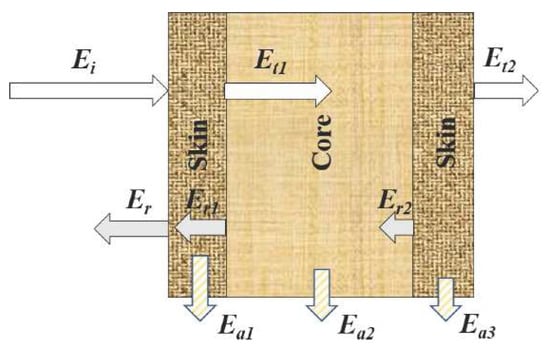 Figure 11 illustrates the sound absorption mechanism of natural-material-based sandwich structure composites. When sound energy (Ei) vertically incidents from one side of the structure, partial sound energy is reflected (Er) by the surface of the composite skin. The incident sound energy is initially absorbed (Ea1) by the FFRC skin through viscous resistance, thermal exchange, and damping of fibers or microfibrils and multilayer cell walls. Partial energy transmits through top skin (Et1) and some energy reflects by the interface of skin and core (Er1). Balsa core absorbs sound energy (Ea2) mainly through visco-inertial and thermal damping, multilayer cell wall damping, and air flow through micropores also causing sound energy dissipation. The residual sound energy was reflected (Er2), absorbed (Ea3), and transmitted by the bottom skin (Et1).