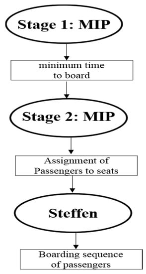 The proposed method and its context are illustrated in Figure 1. The stage-one MIP is identical to the MIP described in Milne and Salari [] and determines an assignment of passengers to seats that minimizes the total time to complete the boarding of the plane. The stage-two MIP determines a more robust assignment of passengers to seats on the plane, while ensuring that the resulting time to board is not more than the minimum time to board that was determined by the stage-one MIP. Once the passengers have been assigned to seats by the stage-two MIP, they board the plane in the sequence determined by the Steffen [] method.