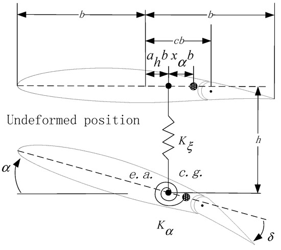 Herein, the interest is to analyze the dynamic response of the system induced by an external disturbance. This disturbance is representative of atmospheric turbulence and gusts, which are treated in more detail in Section 3. A flap is mounted at the trailing-edge of the airfoil, at a distance cb aft of the mid-chord, for GLA. The flap deflection, δ, is defined relative to the airfoil chord.