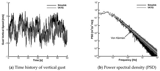 The procedure requires calculating the Fourier transform and its inverse, requiring more computational resources as the time window increases but it was found to be more robust and accurate than other approaches. The method described herein is available in an open-source toolbox (both in MatLAB and Python), which is referred to as the Von Kármán Turbulence Generator (VKTG). The VKTG toolbox implements the mathematical representations of random turbulence defined in the Military Specification MIL-F-8785C and Military Handbook MIL-HDBK-1797, allowing for the dependence of the root mean square turbulent velocity and turbulence length scale on aircraft mission parameters and weather conditions. Figure 2 shows that, at higher frequencies, the PSD of the VKTG model achieves a better agreement with von Kármán spectrum of Equation (8) than the off-the-shelf MATLAB/SIMULINK model. For more information, the reader is invited to refer to Ref. [24] and the on-line documentation (http://daronchlab.com/ (Retrieved 10 August 2018)).