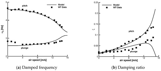 Dependency of damped frequency, and damping ratio, , with freestream speed; aeroelastic parameters from Table 1 ( = 0.175 m and = 28.061 rad/s); flutter speed predicted at 15.28 m/s.