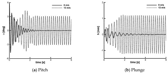 Time-domain response to an initial perturbation in angle of attack ( = 6° at two speeds below the flutter speed, predicted at = 15.28 m/s.