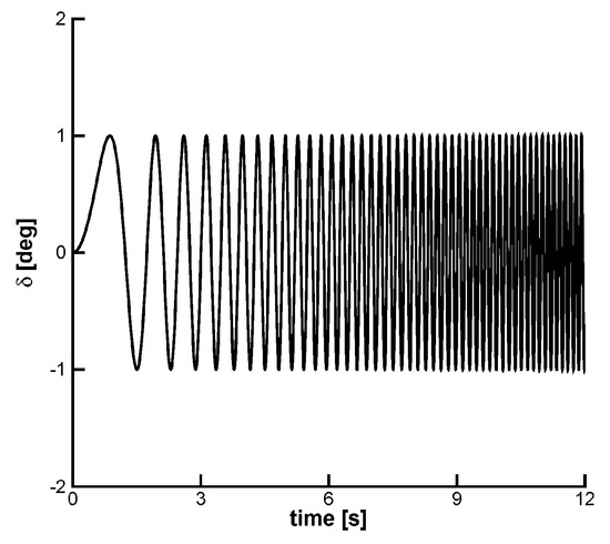 In this work, the parameters of the chirp signal were set to = 0.0° and = 1.0°. The aeroelastic model has two dominant natural frequencies at 2.646 Hz ( = 16.629 rad/s, plunge) and 4.466 Hz ( = 28.061 rad/s, pitch). For increasing dynamic pressure, the pitch and plunge frequencies tend to coalesce, Figure 5 and so the frequency range covered by the chirp signal was chosen between = 0.01 Hz and = 8.0 Hz. The input signal employed for the model identification is illustrated in Figure 7. The aeroelastic response induced by the control surface is shown in Figure 8. The resonant behavior in both degrees of freedom confirms the adequateness of the chosen frequency range.