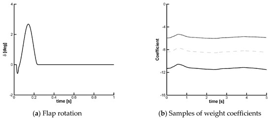 Aeroelastic response with control corresponding to Figure 10: (a) Commanded rotation of the trailing-edge flap; (b) Three samples (out of 20) of the weight coefficients of the controller.