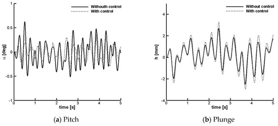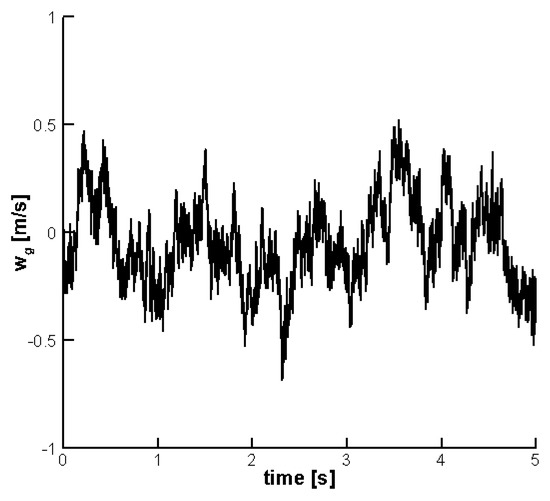 For the random case, atmospheric turbulence was generated with the VKTG toolbox at an altitude = 200 m with the intensity set to “moderate”. The maximum instantaneous gust intensity was set to 10% of the freestream speed, = 8 m/s. The time history of the vertical speed of the turbulence is shown in Figure 12. Figure 13 shows the aeroelastic response with and without control. Similar considerations to those already noted for the discrete gust hold true. The controller is effective at reducing the pitch vibrations throughout the entire duration of the gust encounter.