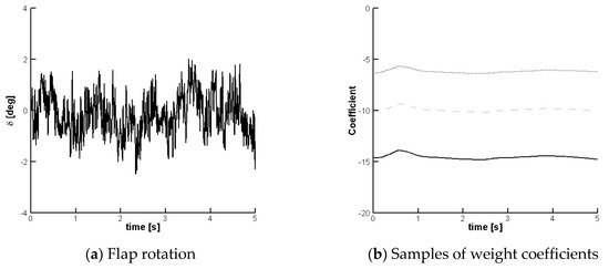Figure 14 shows the time evolution of the control input to achieve the load alleviation and a sample of three coefficients of the controller. It is worth mentioning that the flap rotation and angular speed meet fully physical limitations of the experimental apparatus (rotation up to ±7° and speed up to 15 Hz).