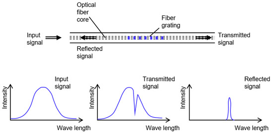 Fiber Bragg grating (FBG) sensors shown in Figure 1 has a series of parallel lines, called gratings, with different refractive indices printed on the core of optical fiber [28]. When the sensor is deformed due to damage, the spacing between gratings is changed. When a broadband light passes through the grating, a specific wavelength is reflected depending on the spacing of grating. When the structure experiences a local strain due to a crack, this spacing changes, and the reflected wavelength is shifted. FBG sensors detect damage by measuring the shift of reflected wavelength. Therefore, FBG sensors can measure damage when the damage causes strain.