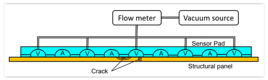 Comparative Vacuum Monitoring (CVM) sensors create a pattern of alternating vacuum and atmospheric pressure galleries, as shown in Figure 2. The concept is that if there is no crack on the surface, the vacuum galleries retain their low pressure. However, if there is crack, it can make a channel between the vacuum and atmospheric galleries, and thus, the air in the atmospheric gallery leaks to the vacuum gallery [35]. Therefore, the low pressure in the vacuum gallery goes up. The level of pressure variation can also indicate the size of cracks [36].