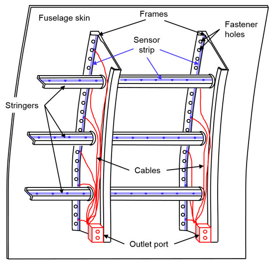 Layout of sensors and cables in fuselage frames and stringers. Blue lines are the sensor strips, while red lines are connection cables.