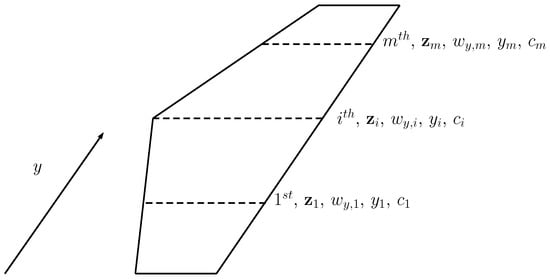 For simplicity, it is assumed that is not a function of the span location y. Then, Expressions (A5) and (A6) are extended to include the equations for all the m strips.
