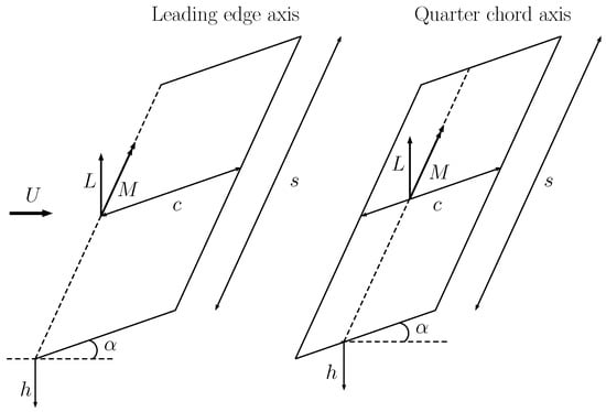 where , h is the plunge displacement, the pitch displacement, the mass, the static imbalance around the pitching axis, the moment of inertia around the pitching axis, and the stiffnesses of the springs providing restoring loads in the plunge and pitch degrees of freedom, respectively, and and are the lift and moment around the pitching axis computed using the VLM or WLL approaches.