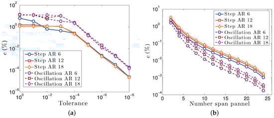 where represents the lift coefficient response at the t-th time instance for the i-th value of the convergence parameter. The latter can be either the time step tolerance of the Runge–Kutta–Fehlberg scheme or the number of strips; represents the reference lift coefficient against which the convergence is assessed. This reference is computed for an appropriately high value of the convergence parameter.