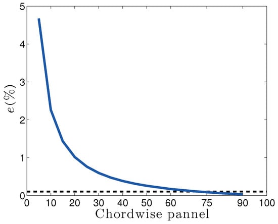 Figure 6 plots the variation of the error of Equation (29) with the number of chordwise panels for a rectangular wing () oscillating around its leading edge with a reduced frequency . The reference number of chordwise panels is . The number of spanwise panels is set to 15. It can be seen that is sufficient to achieve errors for the rectangular wing case with a leading edge pitch axis. The figure also shows that the convergence is independent of the aspect ratio. This is logical since the convergence parameter is the number of chordwise panels.