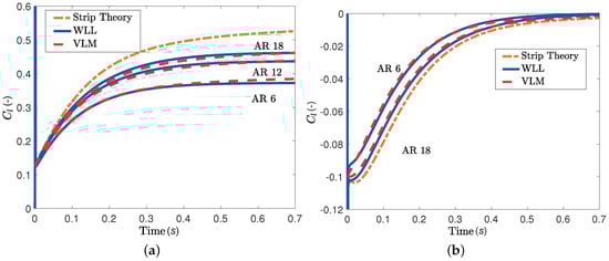 The VLM approach is still more general than the WLL technique, as it can easily represent sweep. The advantage of WLL is the fact that the resulting aerodynamic loads are written in state space form, as functions of the structural and aerodynamic states. They can therefore be easily included in aeroelastic and flight dynamic calculations. In contrast, the VLM or DLM techniques result in time-marching simulations or, if using a modal frequency domain technique, in Equation (33), which is a hybrid time-frequency domain equation that must be transformed to the time domain in order to carry out aeroservoelastic calculations. In the present examples, the wings were rigid with discrete degrees of freedom, but flexible wings with generalized modes can also be treated. Finally, the WLL calculations are significantly faster than time domain VLM numerical simulations.