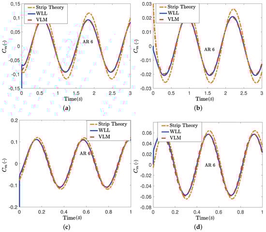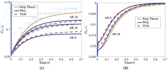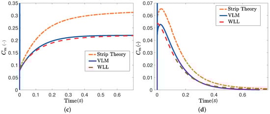 Comparison between VLM, WLL and strip theory for a rectangular wing undergoing a step motion. (a) Lift coefficient, pitch step A = 5° (b) Lift coefficient, plunge step A = 0.1 m; (c) Moment coefficient, pitch step A = 5°; (d) Moment coefficient, plunge step A = 0.1 m.