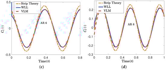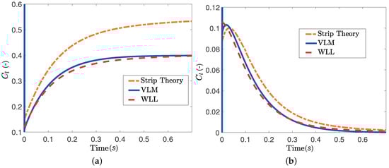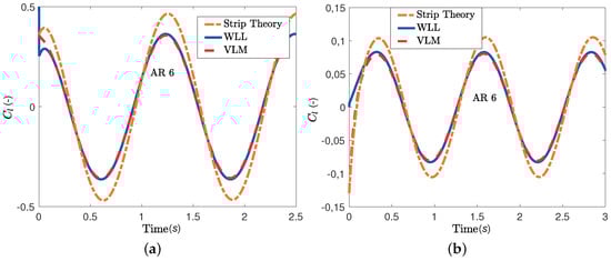 where N is the number of time instances, represents the lift or moment coefficient computed by the VLM at the r-th time instance and represents the lift or moment coefficient computed by the WLL approach at the r-th time instance.
