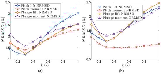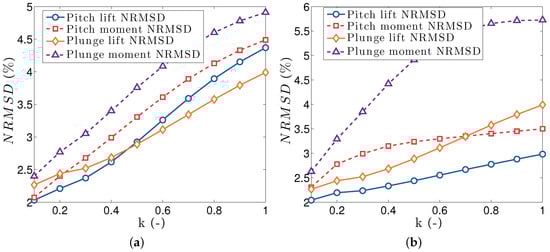 NRMSD between VLM and WLL aerodynamic responses for a tapered wing undergoing oscillations motion. (a) Pitch axis on root leading edge; (b) Pitch axis on root quarter chord.