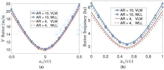 The resulting flutter speed and frequency values are plotted against the position of the pitch axis in Figure 13 for two aspect ratios: and . Figure 13a plots the flutter airspeeds and shows that the VLM and WLL predictions are in good agreement with each other for both aspect ratios. Figure 13b plots the flutter frequency predictions; the agreement is still very good as the highest frequency discrepancy is of the order of 5%. It can be concluded that the Wagner lifting line method can predict accurately the flutter of a wing with a finite span.