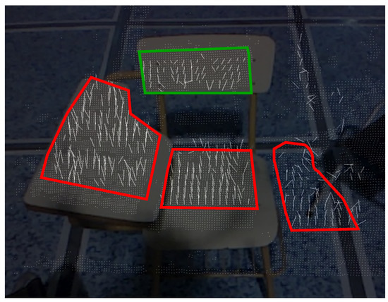 Chair as a ground obstacle used in the real flight experiments with all the extracted normals. The normals within the red colored area represent are the horizontal plane clusters and the ones within the green-colored area represent the vertical plane clusters.
