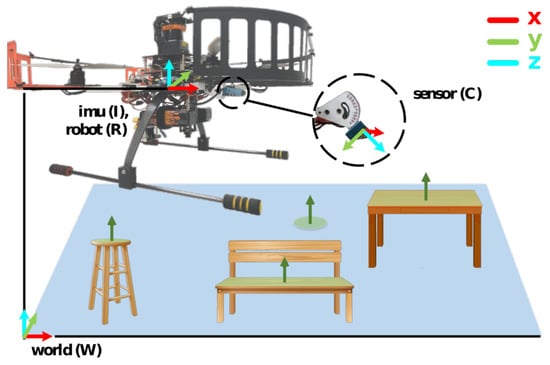 being the transformation of the sensor frame to the world frame . is a composition of the transformation the of sensor frame to robot frame given by and transformation of the robot frame to world frame given by :