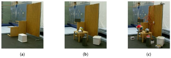 Indoors Environment used in IROS 2011 dataset with increasing complexity of ground obstacles from left to right. (a) Low complexity environment; (b) Medium complexity environment; (c) High complexity environment.