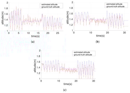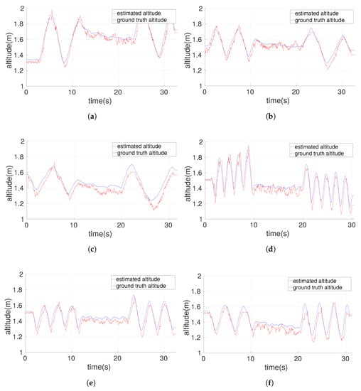 Szafranski et al. [] provide a solution for estimating the UAV altitude fusing the altitude derived from a pressure sensor with an ultrasound sensor. The authors pre-filter the readings coming from both sensors and use a filter to fuse the sensor measurements, based on their assigned weights. The assigned weight for the ultrasound is higher in lower altitudes due to higher accuracy and less for the pressure sensor and vice a versa. At higher altitudes greater than 2–3 m the ultrasound sensor provides noisy measurements of altitude and the filter mostly depends on the pre-filtered altitude provided by the pressure sensor. The authors do not estimate any bias which might be present in the altitude measured by the pressure sensor and they do not compare the estimated altitude with a ground truth system.