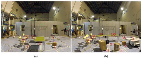 Real flights performed in an indoor environment with different configuration of the ground obstacles. (a) Static ground obstacles environment with each number representing a ground obstacle; (b) Dynamic ground obstacles environment with each number representing a ground obstacle. Numbers 2, 3, 4 and 5 represent dynamic obstacles.