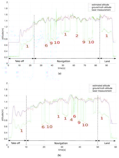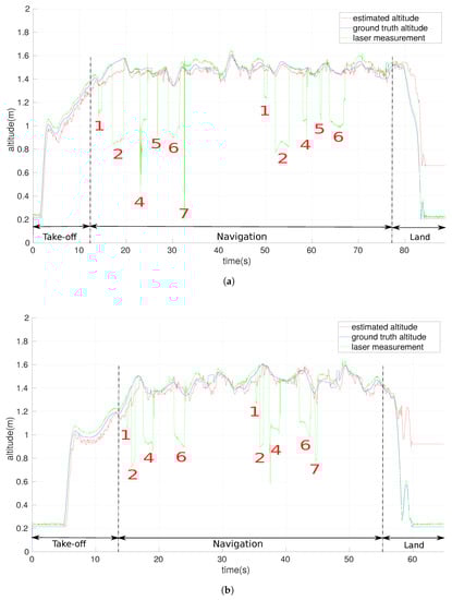 The flight altitude estimation in presence of dynamic obstacles can be appreciated from Figure 8a,b. During the take-off phase in presence of obstacle number 1, the laser measurements are with respect to the obstacle 1 whereas our algorithm having the input height of the obstacle 1, estimates the correct flight altitude of the UAV during the entire take-off phase. During the entire navigation stage due to the presence of several random moving dynamic as well as static obstacles, several laser measurements get referred to the obstacles instead of the ground, making it impossible to use such measurements for estimating the flight altitude fo the UAV. As our approach rapidly maps all the present horizontal planes, it can accurately estimate the flight altitude of the UAV in such environment at both slow as well as high UAV velocities of m/s and 1 m/s respectively. It can also be appreciated from Figure 8a,b that as our algorithm maps and localizes based on all the present horizontal planes, random and dynamic nature of the ground obstacles has no effect on the performance of our algorithm.