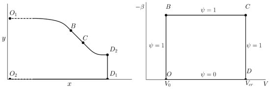 Furthermore, we require that along the rectilinear part , the velocity magnitude is monotonically increased from to critical value such that . Since along , it is mapped to the horizontal line segment. Finally, we assume that along the part, the velocity magnitude equals , so it is mapped to the vertical line segment. Both ends of the straight sonic line are mapped to the point D.