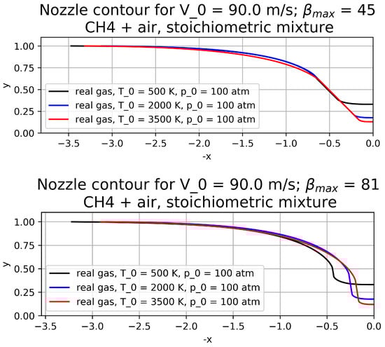 As expected, the nozzle shape strongly depends on T since the chemical composition significantly changes along the nozzle. In the case of K, there are no reactions, and the computed contour coincides with that computed using the perfect gas model. It is worth noting that the proposed method allows one to compute contours with any including .