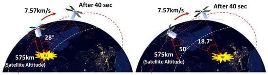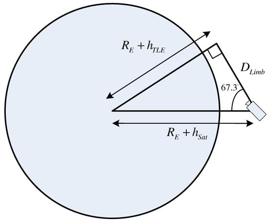 Detection of TLEs near the Earth’s horizon. The line of sight angle to the TLE is computed as by simple trigonometry, which is within the observation range of the TLE observation system. The distance to the TLE is then denoted by .