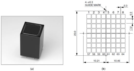 Multi-anode photon-multiplier tube (MaPMT) by Hamamatsu. (a) H7546B MaPMT [30]; (b) Sensing plane containing 8 × 8 anode array.