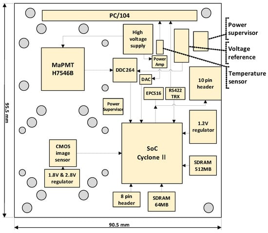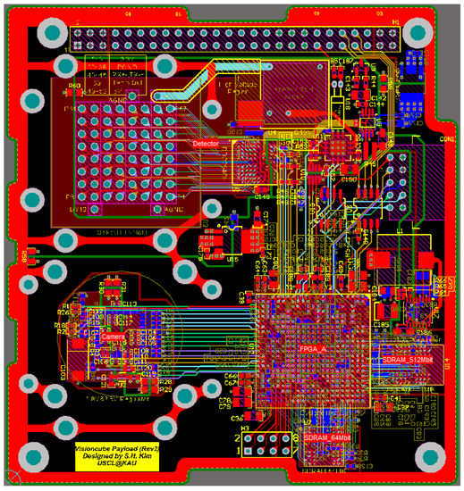 Figure 5 shows the 8-layer printed circuit board (PCB) artwork design for fabrication. The size of the board is 90.5 mm × 95.5 mm, which is specified by the CubeSat electrical board standard. The MaPMT and the CMOS image sensor are carefully placed in consideration of the mechanical design of lens adapter and housing fixture. The trace wire from the DDC264 is directly connected to the MaPMT while minimizing its lengths to prevent signal pollution.