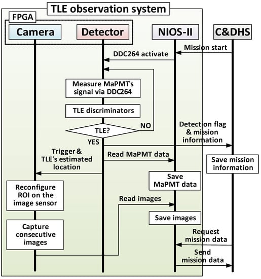 Operation sequence of TLE observation system. The TLE observation system conducts its mission independently after receiving the start command from C&DHS. The Nios-II manages the system and communicates with C&DHS.
