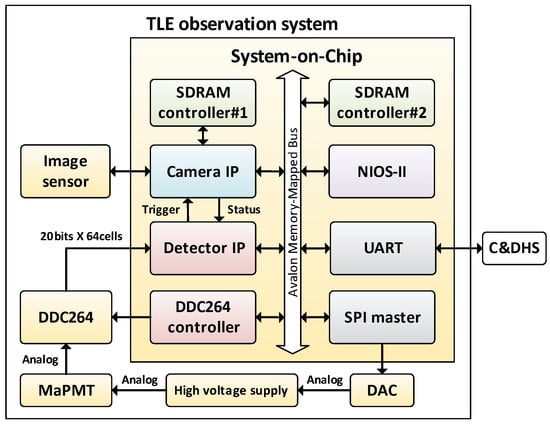 The hardware of the TLE observation system is composed of six main components: an SoC chip, a multi-anode photon-multiplier tube (MaPMT), a high voltage supply for the MaPMT, an analog-to-digital converter, a CMOS image sensor, and two synchronous dynamic random-access memories (SDRAMs) as video buffer. The SoC chip, Cyclone II SoC by Intel (Santa Clara, CA, USA) is chosen as the main processor since it has sufficient on-chip memory and user-configurable I/O pins, which can deliver high performance and low power consumption at a reduced cost.
