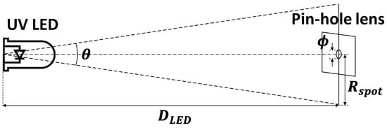 where is the beam angle of the UV LED. Although the UV LED delivers most of the radiant power to the front, but here it is assumed that the UV LED is regarded as a point light source and emits light in three-dimensional space. Hence, the equivalent solid angle of the UV LED beam, , is determined by the ratio of the total irradiated area of a sphere at the radius of to the area of the light spot .