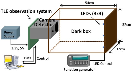 The block diagram of the ground simulation setup is shown in Figure 12. There are assorted LEDs arranged by 3 × 3 array configuration on the wall of the dark box. The LEDs are driven by an external function generator to simulate TLE pulses in various amplitude and width. In particular, five 405 nm UV LEDs are employed to imitate randomly generated blue jets and the rest are used to simulate other interference sources.