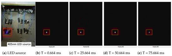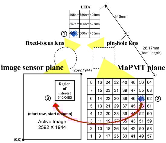With the major components of the hardware logic are verified for its functionality, the actual operation of the TLE observation system was verified on the ground simulation facility. Figure 13 illustrates a scenario for this experiment. As the targeted TLE is assumed to be a blue jet, a 405 nm UV LED on the bottom left corner blinks every 1 s and is turned on for 100 ms. As soon as the detector IP senses the flash light on the 54th cell of the MaPMT, it triggers the camera IP with the corner coordinates for the ROI of which the size is predetermined by 640 by 480 px. Then the camera IP scans the internal buffer of the CMOS image sensor and only extracts the ROI pixels out of entire active image pixels.