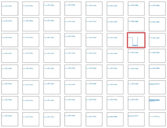 Graph of MaPMT measurements for 128 frames from 1st cell (left bottom corner) to 64th cell (right top corner). x-axis is the number of frame and y-axis is ADC value. On the 54th cell (red box), the ADC value abruptly dropped as soon as receiving the flash light.