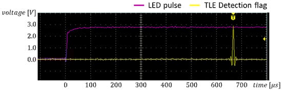 Latency between the UV LED pulse and the TLE detection flag. The latency was 664 s which is caused by the TLE detection algorithm.
