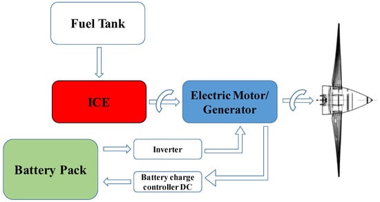 A parallel hybrid electric architecture was chosen after a complete analysis of the various configuration alternatives. With a parallel architecture, the ICE was chosen to ensure the power required for cruising, while the electric motor (EM) intervened at the stage where maximum power is required (takeoff and climb). In this way, the ICE can operate at minimum specific consumption (maximum efficiency) during cruising, while using the electric machine as a generator to recharge the battery pack. The layout of the chosen architecture is presented in Figure 1.