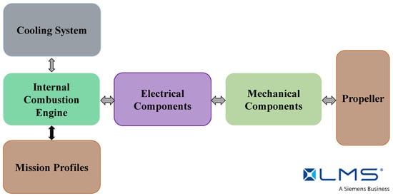 The main components of the proposed hybrid electric propulsion system were selected mainly for their performance and weight. In the next section, a numerical model of the entire propulsion system is described. The model was constructed using the lumped parameter code AMESim LMS® (developed by Simerics®, 1750 112th Ave NE, Ste C250, Bellevue, WA, USA) [16]. The numerical model was then used for predicting the performance of the overall system to allow the assessment and validation of the control strategies. Each part of the propulsion that was included in the model was divided into mechanical elements, signals, propeller, mission profiles, EM and ICE.