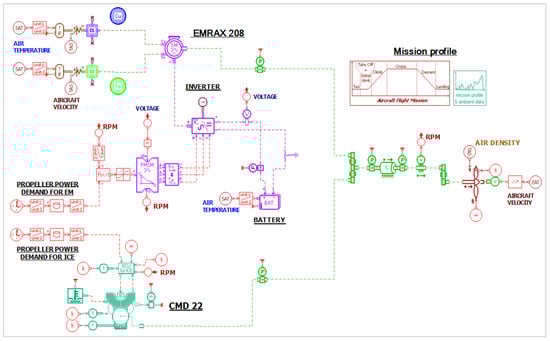 Each unit shown in Figure 3 was modelled using the commercial code AMESim® developed by Siemens®. The entire model of the hybrid electric propulsion system is shown in Figure 4.