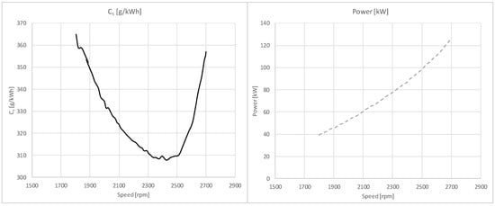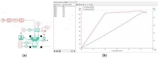 The sub-model of the CMD 22 engine was included in the entire scheme adding the components in Figure 5a. The software had a specific tool for the ICE, using as input the data already presented in Table 1 and the torque curve. The model consequently generated a power curve (Figure 5b) and then, with post-processing, defined the consumption, BMEP, IMEP, FMEP and pollution, according to a mathematical predictive model.