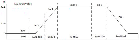 Before describing the model result, the input to the model must be defined. Inputs are the mission profiles and the flight speed of the aircraft. The “training” is one of the mission profiles analyzed in this paper, and is composed of repeated segments. Excluding the takeoff and taxiing segments, which occur only once, the other segments are repeated, and interspersed with “touch and go” phases for climbing again. For this reason, this mission profile is also called the “touch and go” profile. The training profile is shown in Figure 6.