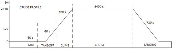 The cruise profile, as shown in both Table 6 and Figure 7, consists of four segments. The first is the takeoff, which lasts 60 s, followed by the climb, with a duration of 720 s, and the main part is the cruise segment, with a duration of 8400 s. The final segment is the landing, with a duration of 720s. Therefore, for this profile, there is no “touch and go” as in the training profile.