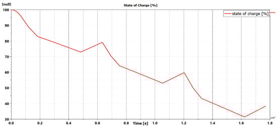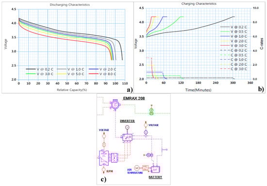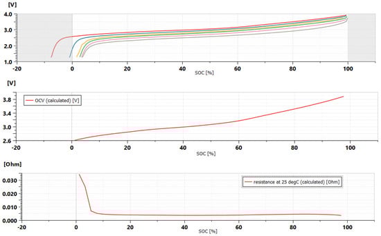 The model of the battery pack is shown in Figure 8. All the inputs to the numerical model were implemented as the number, the disposition and the capacity of the cells, resistance and the open circuit voltage as a function of the state of charge (SoC). The resistance and the open circuit voltage, as functions of the SoC, were valued including the discharge curves in Figure 9. Those trends have been plotted as a function variation of the C-rate. In the numerical model, the input of the battery pack (shown in Figure 8a,b) was obtained for the datasheet of the chosen battery pack. The numerical model, as output, evaluates the open circuit voltage (OCV) and the resistance at 25 °C as a function of SoC (Figure 9). All of the evaluated information was sufficient to calculate the true SoC during the simulation, as well as the variation of current and voltage and the apparent power guaranteed.