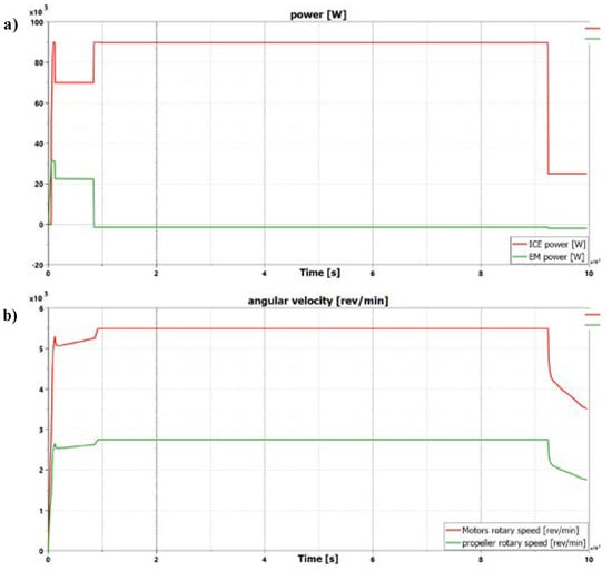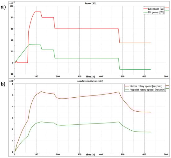 In Figure 14a, the power comparison shows that the green line, related to the electric machine, becomes negative when it works as a generator. Figure 14b represents the speed of both motors and the propeller speed, i.e., half of the motor speed.