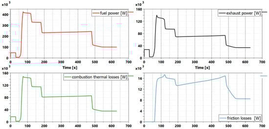 Considering a maximum power of 122 kW at 100 s, Table 10 presents the values of the fuel power, exhaust power, friction power losses and mechanical power. These values allow the efficiencies at maximum mechanical power to be calculated. The engine performance relative to the maximum mechanical power are shown in Table 11.